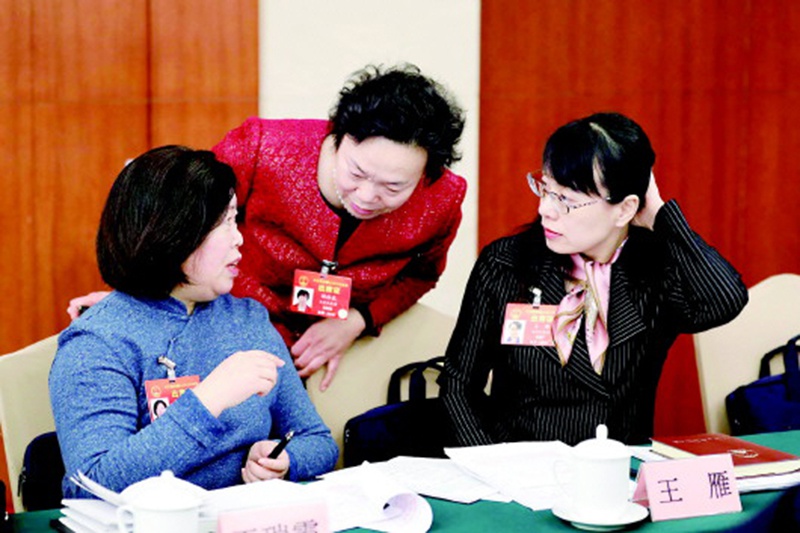 山東代表團(tuán)代表胡桂花(中)、王瑞霞(左)、王雁,討論支持民營企業(yè)發(fā)展的政策舉措如何落地落實。(轉(zhuǎn)自《大眾日報》手機(jī)客戶端)