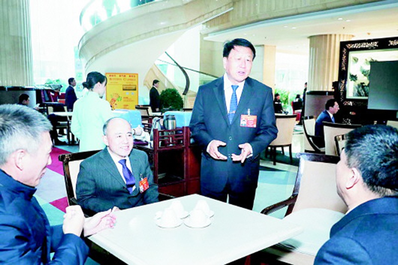 3月12日,李登海(站立者)、宮明杰等山東代表團(tuán)代表討論有關(guān)知識產(chǎn)權(quán)保護(hù)的話題,認(rèn)為應(yīng)把對新品種的保護(hù)提升到法律層面,為發(fā)展現(xiàn)代種業(yè)保駕護(hù)航。(轉(zhuǎn)自《大眾日報》手機(jī)客戶端)