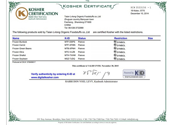 日前,泰安綠龍有機食品有限公司順利通過歐美“KOSHER”認證。 2014年11月9日至10日,“KOSHER”認證機構(gòu)審核人員參觀了泰安綠龍公司的生產(chǎn)現(xiàn)場,并對公司的質(zhì)量和環(huán)境管理體系進行了嚴格的考察、評估,12月10日,綠龍公司取得“KOSHER”認證證書!